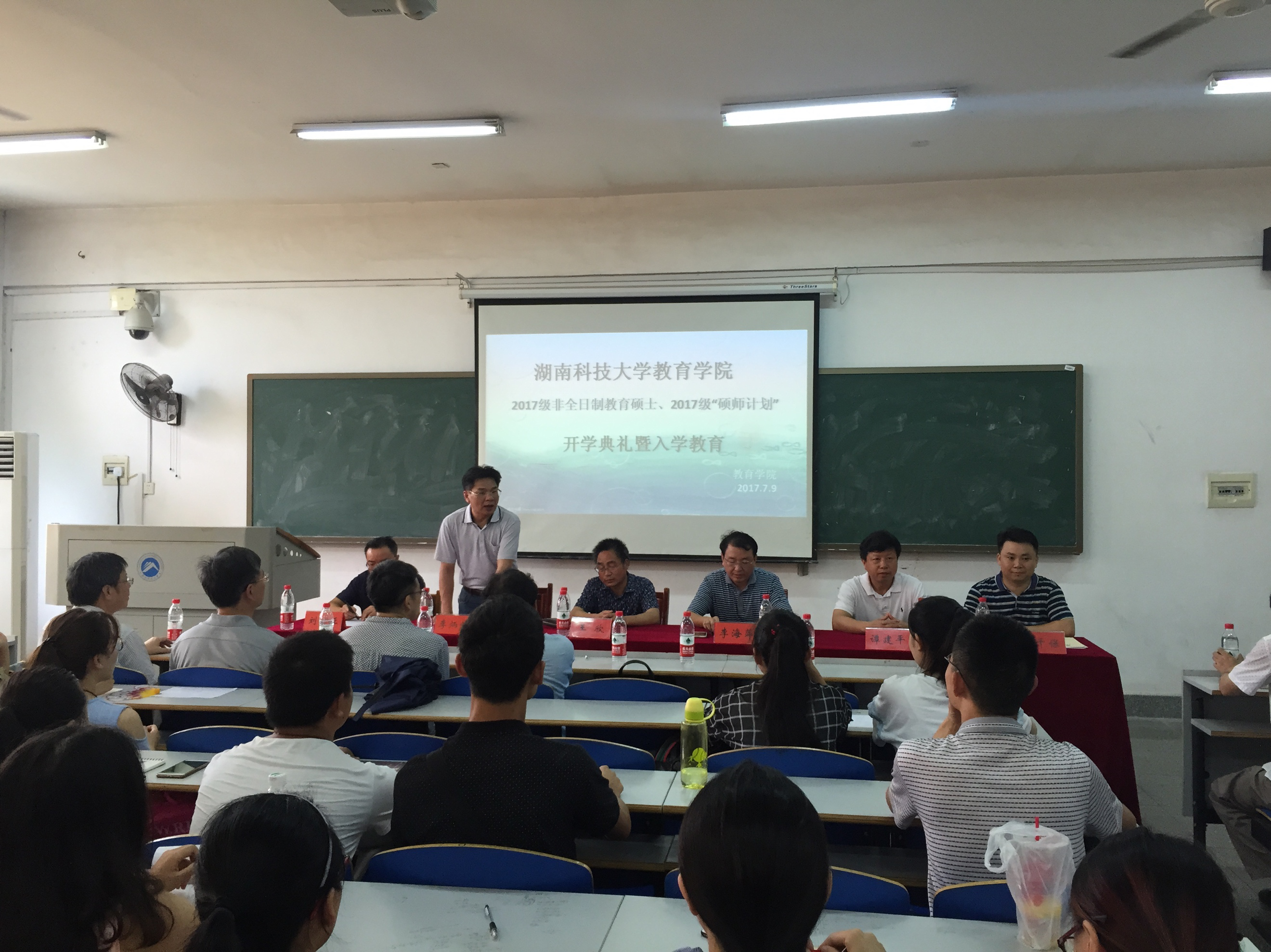 2017年7月9日下午,教育学院2017级非全日制教育硕士与“硕师计划”新生开学典礼暨入学教育在九教408隆重举行。教育学院院长李海萍、教育学院党委书记李炳煌、校社科联副主席谭建平、研究生院副院长王欣、教育学院副院长谭千保、教育学院党委副书记刘辉亚,各专业领域负责人、研究生导师和2017级新生参加典礼。典礼由我院党委书记李炳煌主持。