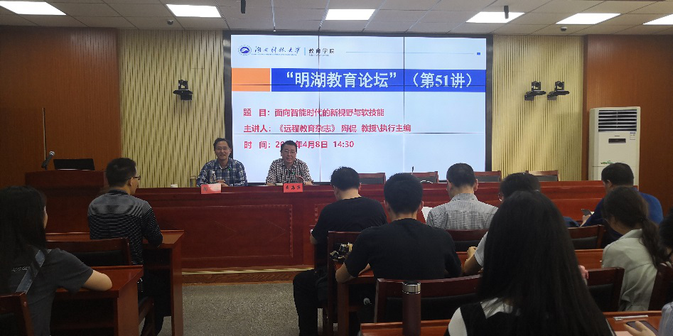 2019年4月8日下午,《远程教育杂志》执行主编陶侃编审做客“明湖教育论坛”,为我院师生带来主题为“面向智能时代的新视野与软技能”的学术报告。报告会由教育学院院长李海萍和教育技术学专业带头人王伟清主持。