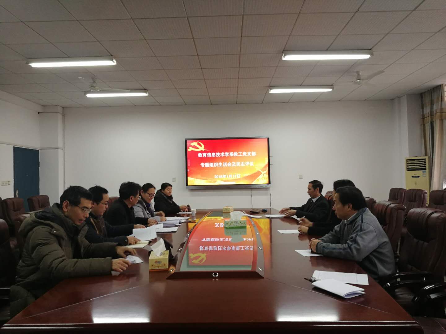 您所在的位置: 首页» 学院新闻 教育学院教工党支部召开专题组织生活会 时间:2018-01-21 00:00:00 2018年1月,根据学校安排,教育学院各教工党支部相继召开专题组织生活会,并开展了党员民主评议。