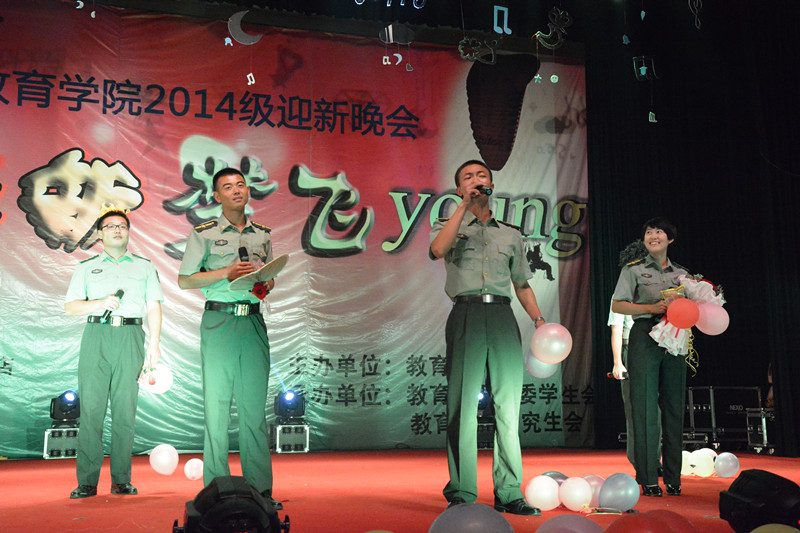 我们纵情高歌,歌唱美好未来。歌曲联唱《朝花夕拾》,乐器演奏《梁祝》,清脆的嗓音,悠扬的笛声,将教育学子的多才多艺展现的淋漓尽致。更是有那么一群人,他们自己不是新生,却和新生一起在烈日下出行,他们就是可爱的助班和可敬的教官。短暂的告别,眼里饱含着泪水,不苟言笑的他们更是用着歌曲《如此荣幸遇见你》和《战友你还记得吗》展现着自己的“心迎新”的可爱模样。
