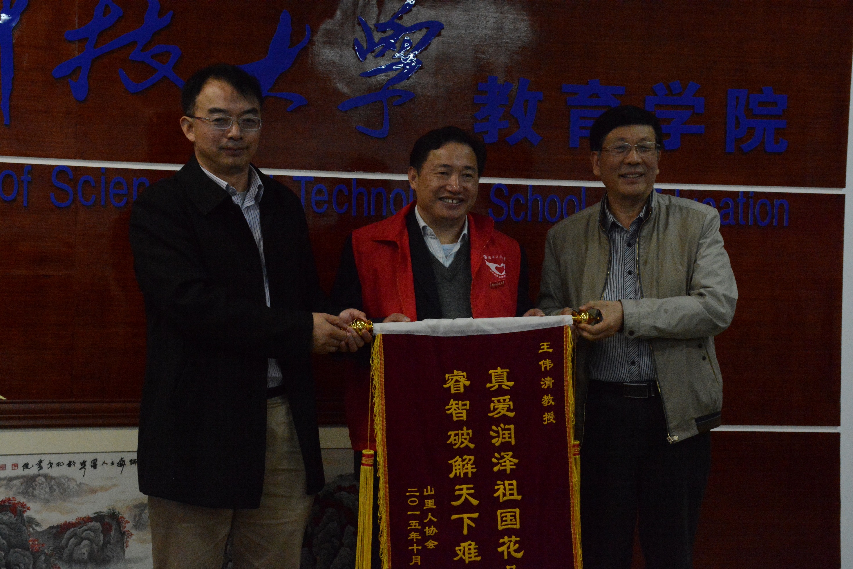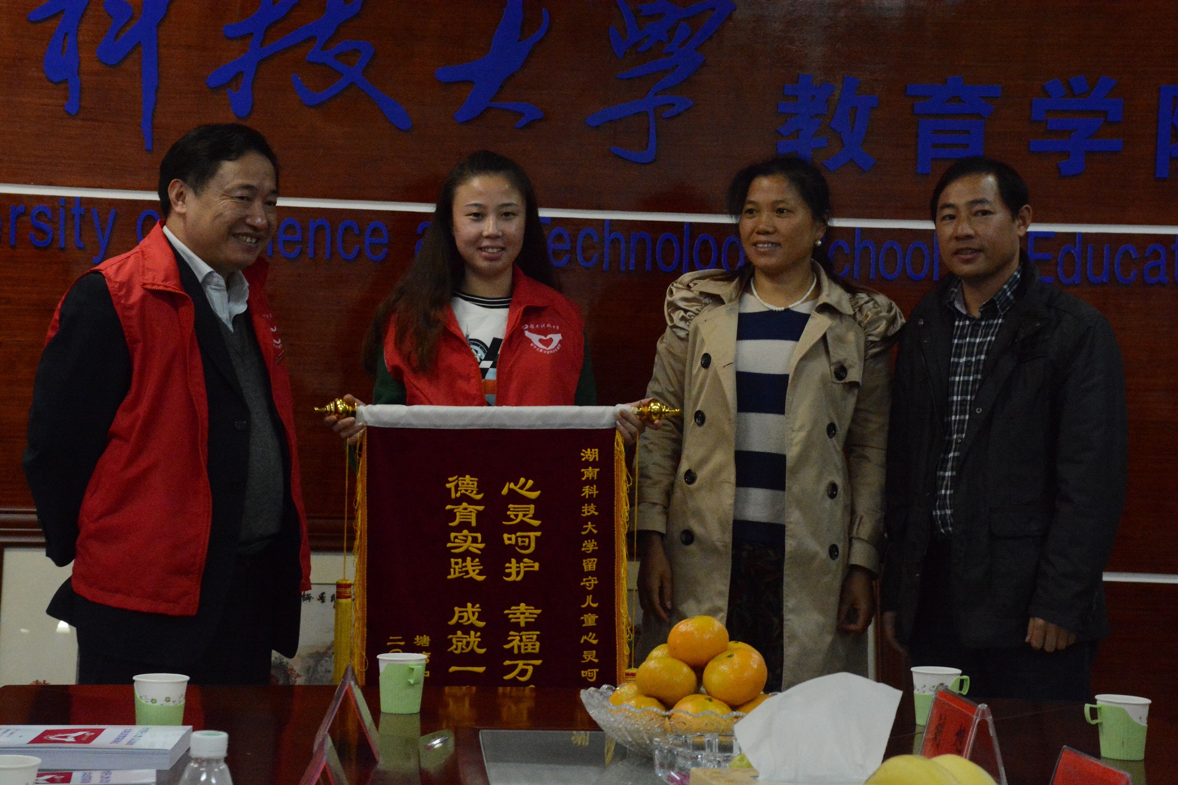锦旗授予仪式正式开始,塘湾中学及山里人协会代表为唐许汉校长及戴志斌教授,心灵呵护志愿团代表为王伟清教授。星眸闪闪,锦旗飘飘,那上面热情似火的大字既蕴含着对志愿团沉甸甸的谢意,又是双方多年友谊的有力见证!双方也将在呵护留守儿童这条仁爱之路上携手并肩,越走越远!至此,湖南科技大学团委代表唐璟老师充分肯定了志愿团一贯以来注重实践与理论相结合的优良作风,并表示,团委会不遗余力地携手心灵呵护志愿团与地方教育机构为留守儿童撑起一片蓝天。
