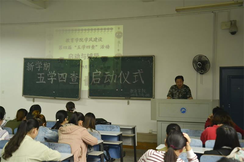 为了抵制不良文化的负面影响,营造良好的学习氛围,提高学风建设的实效性,创造学风建设特色,创建良好的特色文化,教育学院对学风建设进行了多年的探索,形成了“五学四查”的理念和做法。为了推广新做法,2016年10月11日15:00在第八教学楼1―4开展新学期“五学四查”会议,莅临本次大会的嘉宾有教育学院院长李海萍教授、院党委副书记王伟清教授、学工办辅导员尹琼芳老师、李涛老师、练素华老师以及教务办主任王方老师,还有14、15级各班班长、团支书、危机信息员和学习委员。