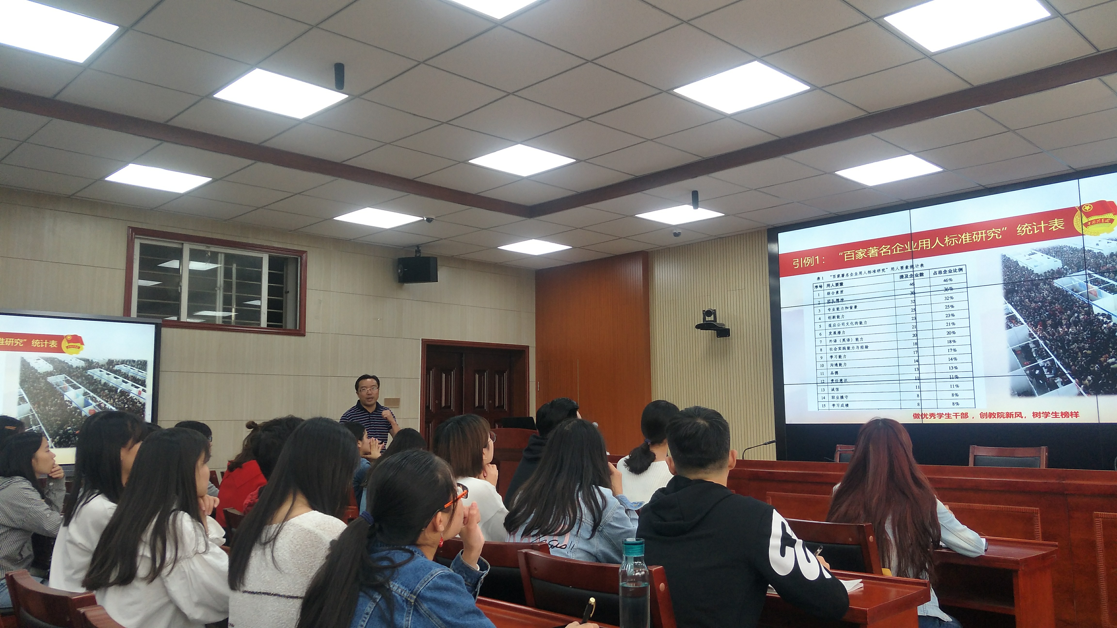首先,刘辉亚以“百家著名企业用人标准研究表”作为引例,指出学生的综合素质的重要性远远大于学业成绩。接着从学生干部角色定位、学生干部应具备的素质与能力、学生干部的工作流程与方法和当好学生干部的几点要求四大部分进行详细讲解。刘辉亚让在座的学生干部一起思考:我为什么在这里?如何准确定位我的身份?什么才是一个优秀的学生干部?他认为学生就要以学习为主,学习是学生的天职,应摆在首位。首先要求自己做一个优秀的学生,其次才是学生干部,最后做一名优秀的学生干部。学生干部是服务者,是同学们的楷模和榜样。一个优秀的学生干部应具有良好的思想政治素质、高尚的道德素质和健康的身心素质;能够正确处理好学习与工作、个人与集体、奉献与荣誉的关系;能积极参与活动、主动接受任务,创造性开展工作;在工作流程方面,要精心策划、认真组织、狠抓落实、及时总结,关键环节是执行;在工作方法方面,要树立“思路清晰布大局、团结协作出成绩、组织有序提效率、总结到位促创新”的工作理念,来指各项工作的有序、有效开展。