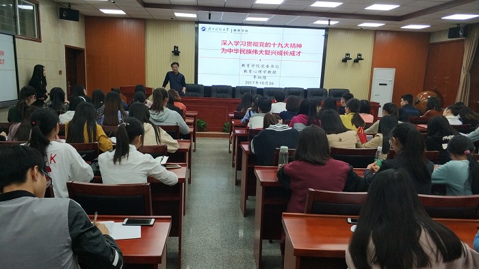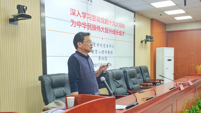 李书记指出,习总书记所作的十九大报告,站位高远、举旗定向,把握大势、高屋建瓴,深邃精辟、气势磅礴,是我们党理论创新、实践创新、制度创新最新成果的集中体现,是马克思主义的纲领性文献,具有很强的全局性、时代性、战略性、指导性。他进一步表示,我们作为新一代青年必须努力学习,为未来人生幸福奠基!我们青年一代的成长成才需要认识自己、把握机遇、追求卓越!李书记同时指出,习总书记的报告鼓舞人心、催人奋进,对青年一代寄予了新的希望,对青年工作提出了更高的要求,作为党的后备军,需要切实增强责任感和使命感、为实现人生出彩搭建舞台,团结和带领更多的人在实现中华民族伟大复兴的中国梦中放飞青春梦想,书写人生华章!最后,学院党委副书记刘辉亚对本次培训作出总结。他希望通过培训,让大家更加深刻领会党的十九大会议精神,始终坚持中国共产党的领导,坚持中国特色社会主义道路自信、理论自信、制度自信、文化自信,做好规划,确定目标,蓄足动力,努力提高自身素质,全面掌握专业知识,积极探索高新技术,不忘初心,牢记使命,为实现国家富强,民族振兴,人民幸福的中国梦和建设社会主义现代化强国而贡献自己的力量。同时希望教育学院的莘莘学子紧跟时代浪潮、把握现实机遇,不断开拓创新、砥砺自我!