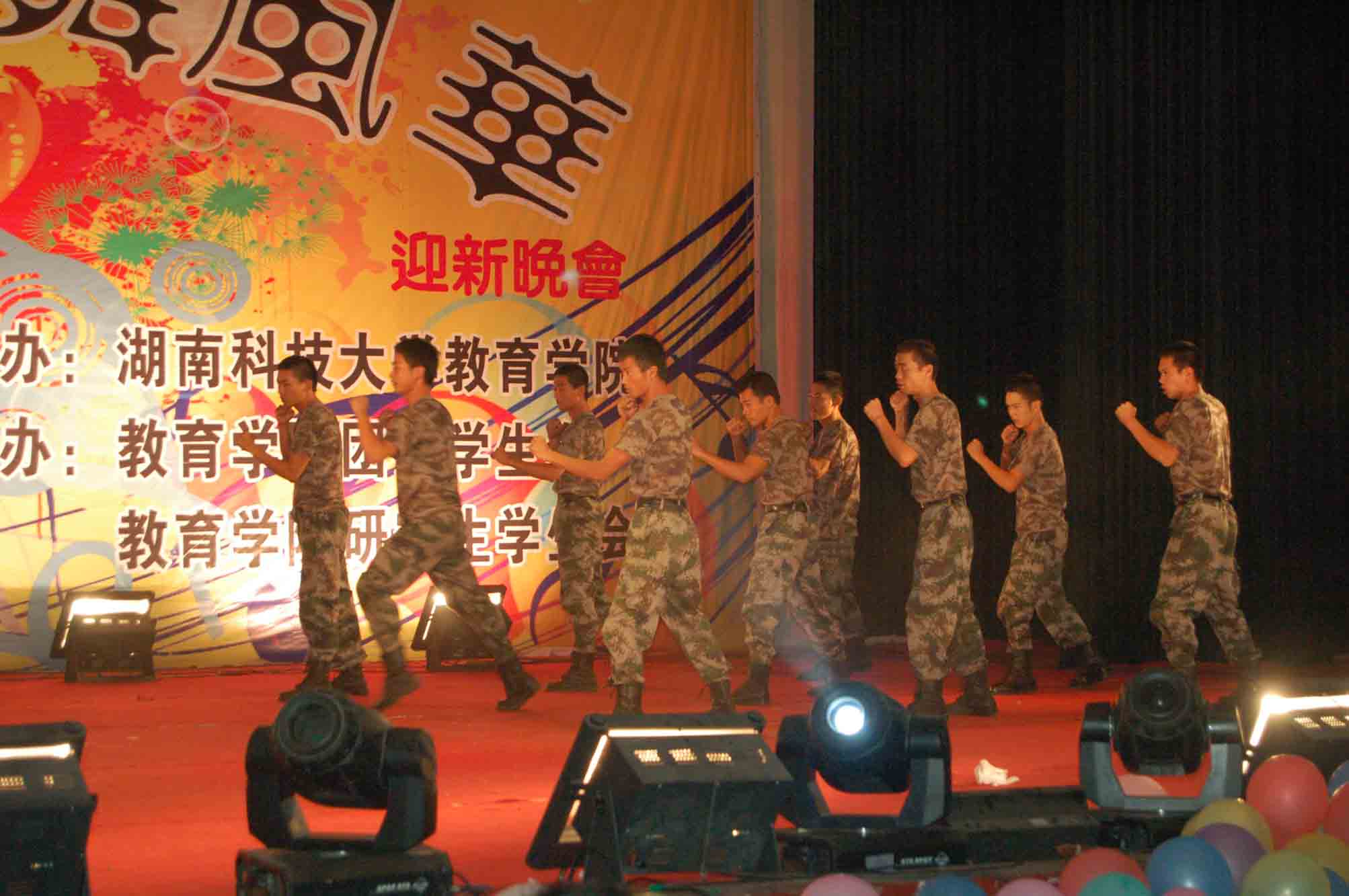 作为大一新生们目前最为亲近的人——助班与教官,他们的表演着实让现场气氛High到不行。助班们的舞蹈诠释了作为学姐的她们,也有独特魅力的一面,歌曲《热情的沙漠》几乎成了全场大合唱,将气氛推到另一高潮,而教官们先是以军人姿态进行了搏击表演,随后又是阳刚似水的柔情对唱《因为爱情》,更是让新生们高声齐呼“亲一个!亲一个!”。