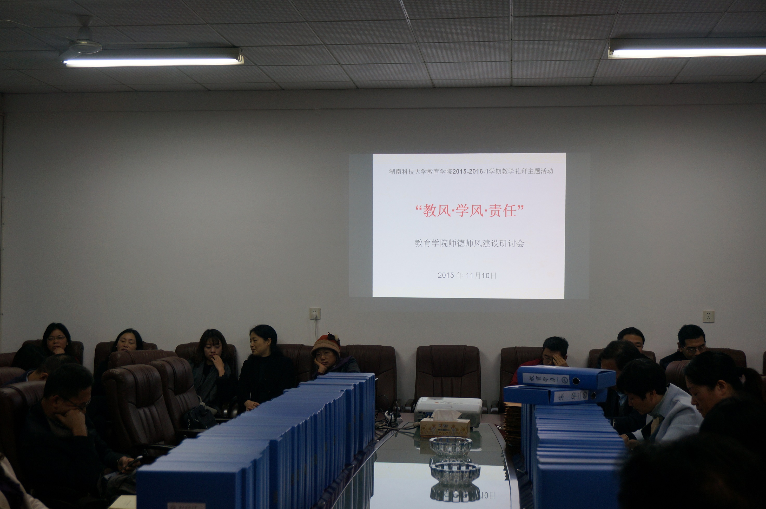 2015年11月10日下午,八教203会议室,教育学院2015-2016-1学期教学礼拜“教风﹒学风﹒责任”——师德师风建设研讨会顺利举行。会议由陈春萍院长主持,学院全体老师参会。