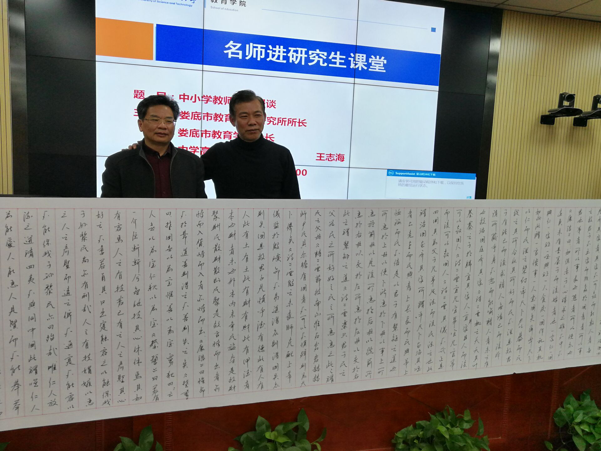 2017年12月12日下午,娄底市教育学会会长、中学高级教师、娄底市教育科学研究所王志海所长莅临我校,在八教308教室开展题为“中小学教师素养漫谈”讲座,2017级全体教育硕士专业研究生和教育学院部分本科生参加了本次讲座,讲座由教育学院党委书记李炳煌教授主持。