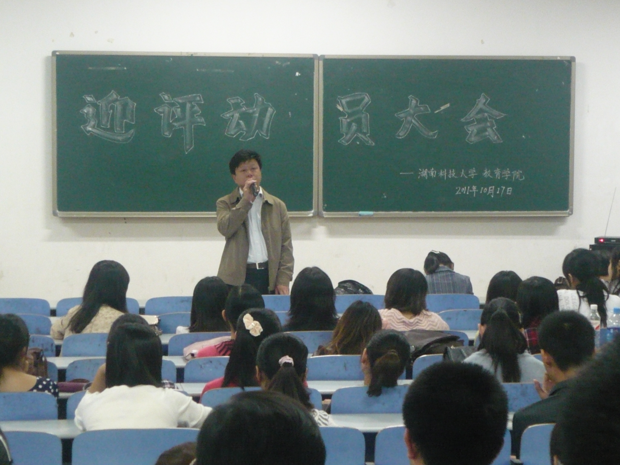 为迎接本月19日至21日全国硕士专业学位教学评估专家团对我院教育硕士学位资格的评估工作,教育学院在院领导的指示下特于本月17日晚18时整在第八教学楼召开群体研究生和学生干部参与的“迎评动员大会”,院党委书记谭建平在学工办胡银华、练素华老师的陪同下出席大会并发表重要讲话。