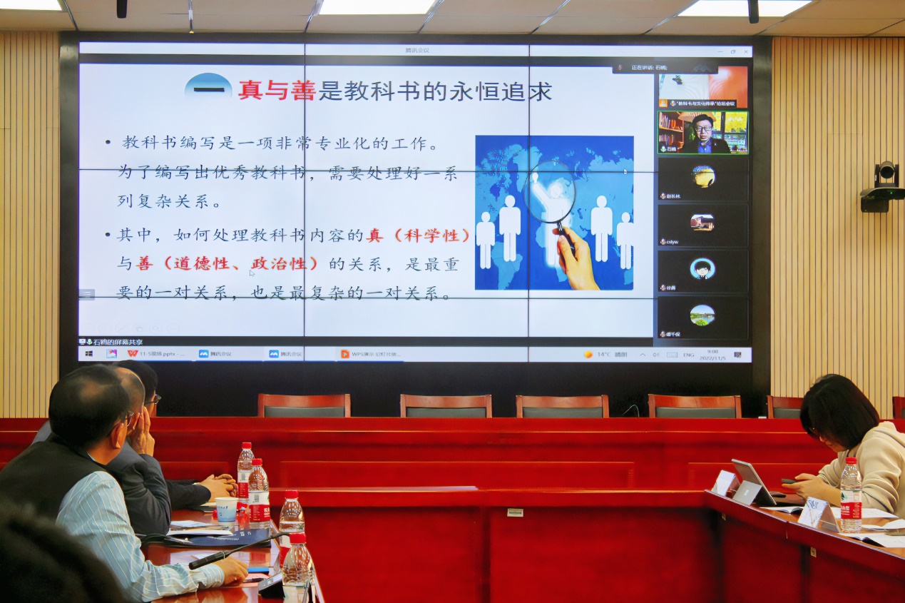 首都师范大学石鸥教授作了题为“在求真与求善之间——教科书文化传承的一点思考”的报告。他的报告从真与善是教科书的永恒追求、正确认识教科书求真和求善的关系、教科书对善的追求是优先追求、高度警觉教科书求善的优势地位四个方面展开。他特别指出,教科书承担着传播真理、揭示谬误的重任,也担负着引领良善、鞭挞丑恶的使命。