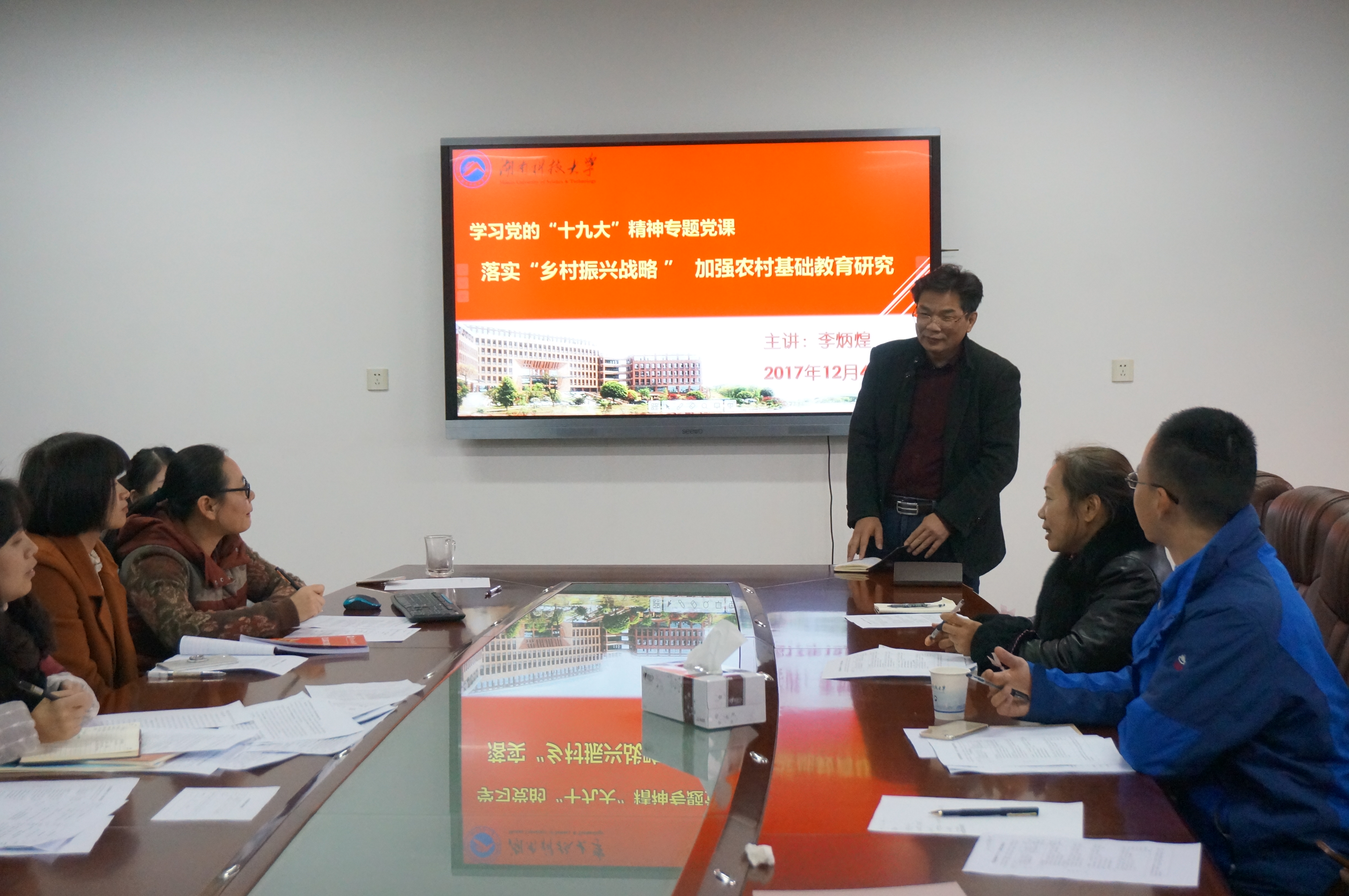 2017年12月5日下午,教育学院党委书记李炳煌教授在八教208会议室主讲学习党的“十九大”精神专题党课,题为《落实“乡村振兴战略” 加强农村基础教育研究》,学院党委中心组成员及各党支部书记参与学习。