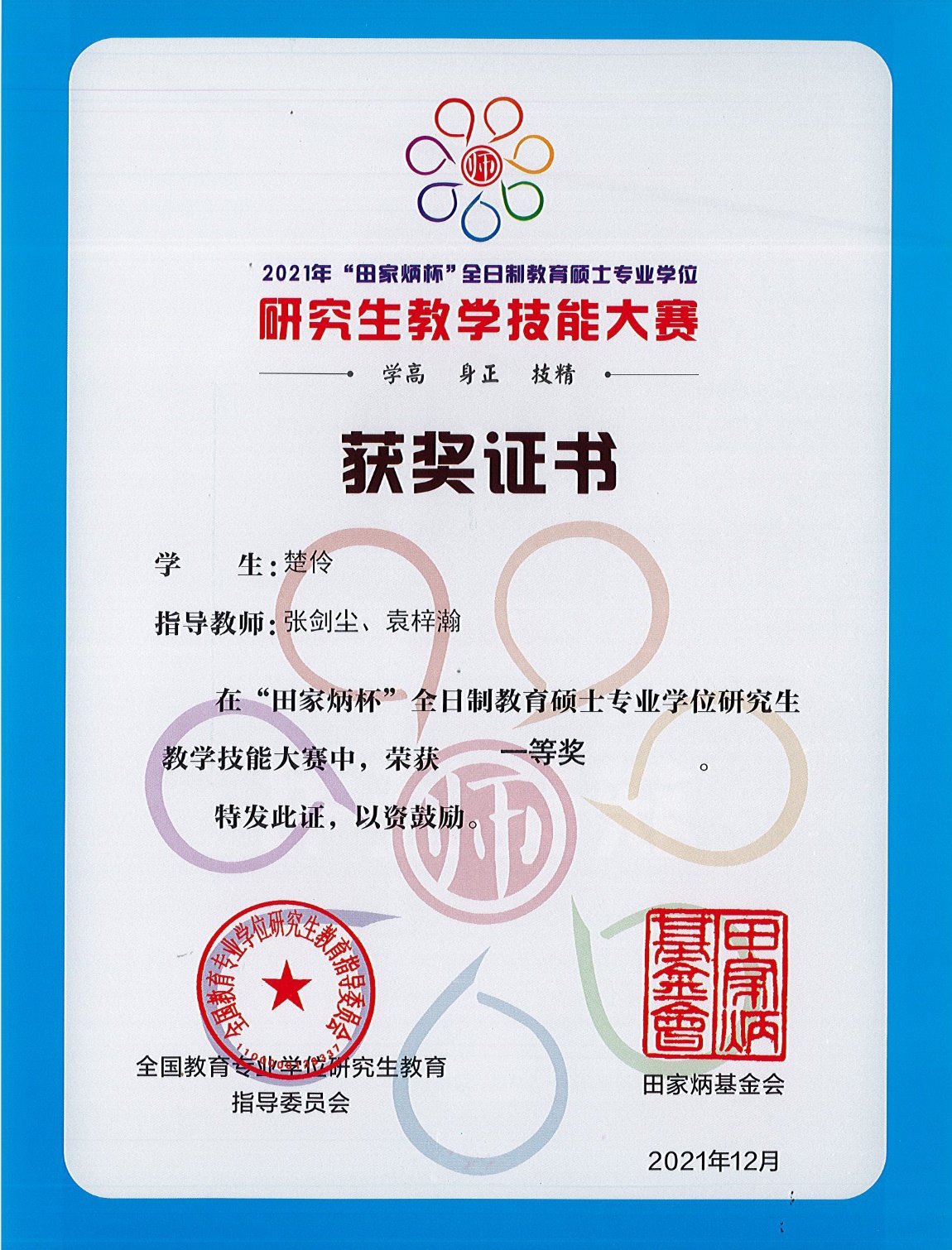 近日,全国教育专业学位研究生教育指导委员会公布了“田家炳杯全日制教育硕士专业学位研究生教学技能大赛获奖名单,我校教育硕士专业学位研究生在本次赛中荣获一等奖二等奖三等奖2项,4老师获优秀指导教师