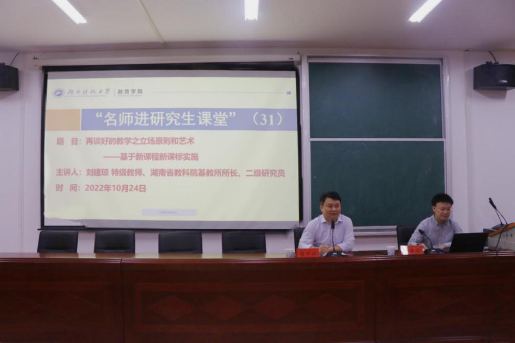 10月24日晚,特级教师、湖南省教育科学研究院基教所所长、二级研究员刘建琼应邀莅临昭潭书院第二教学楼102报告厅,为我院师生带来“再谈好的教学之立场原则和艺术——基于新课程新课标实施”主题讲座。教育学院院长谭千保主持,2022级研究生到场聆听。