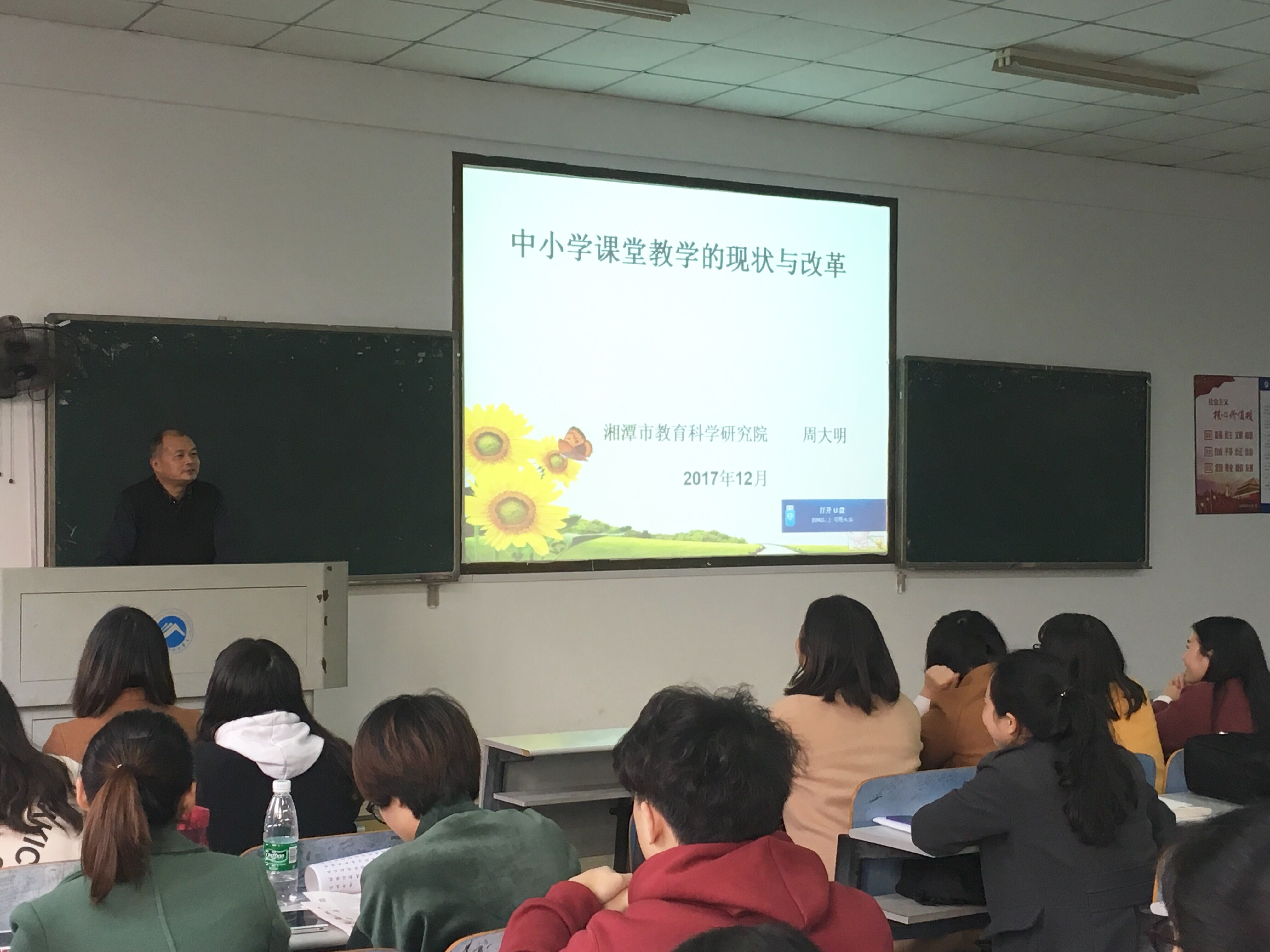 2017年12月6日下午,湘潭市教育科学研究院院长,湖南省中学数学特级教师周大明莅临我校,在八教2-3教室开展题为“中小学课堂教学的现状与改革”的讲座,2017级全体教育硕士专业研究生和教育学院部分本科生参加了本次讲座,讲座由教育学院副院长谭千保主持。