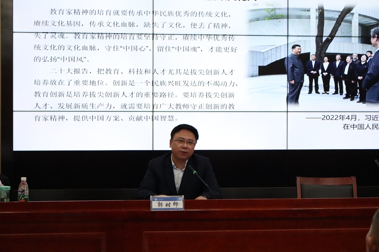 郭时印在主持报告会时指出,周洪宇教授的专题报告有政治高度、理论深度、历史厚度、指导力度,对学校贯彻落实习近平总书记关于教育重要论述,坚持用教育家精神铸魂强师,加强教师队伍建设具有十分重要的指导意义,对培养师范生的教育家精神、提高师范生培养质量,提升师范教育水平具有十分重要的推动作用。希望全校教师和师范专业的学生大力弘扬教育家精神,牢记为党育人、为国育才的初心使命,树立“躬耕教坛、强国有我”的志向和抱负,自信自强、踔厉奋发,为强国建设、民族复兴伟业作出新的更大贡献。