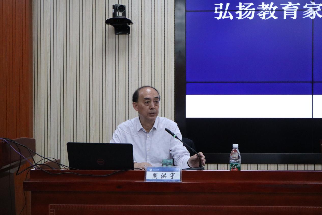 11月12日下午,第十三届全国人大常委会委员、中国教育学会副会长、华中师范大学国家教育治理研究院院长周洪宇教授应邀做客我校湘江高端学术论坛,作了题为“弘扬教育家精神 做行知式大先生”的专题报告。学校相关职能部门负责人、教育学院院领导、师生代表参加。报告会由校党委委员、纪委书记郭时印主持。